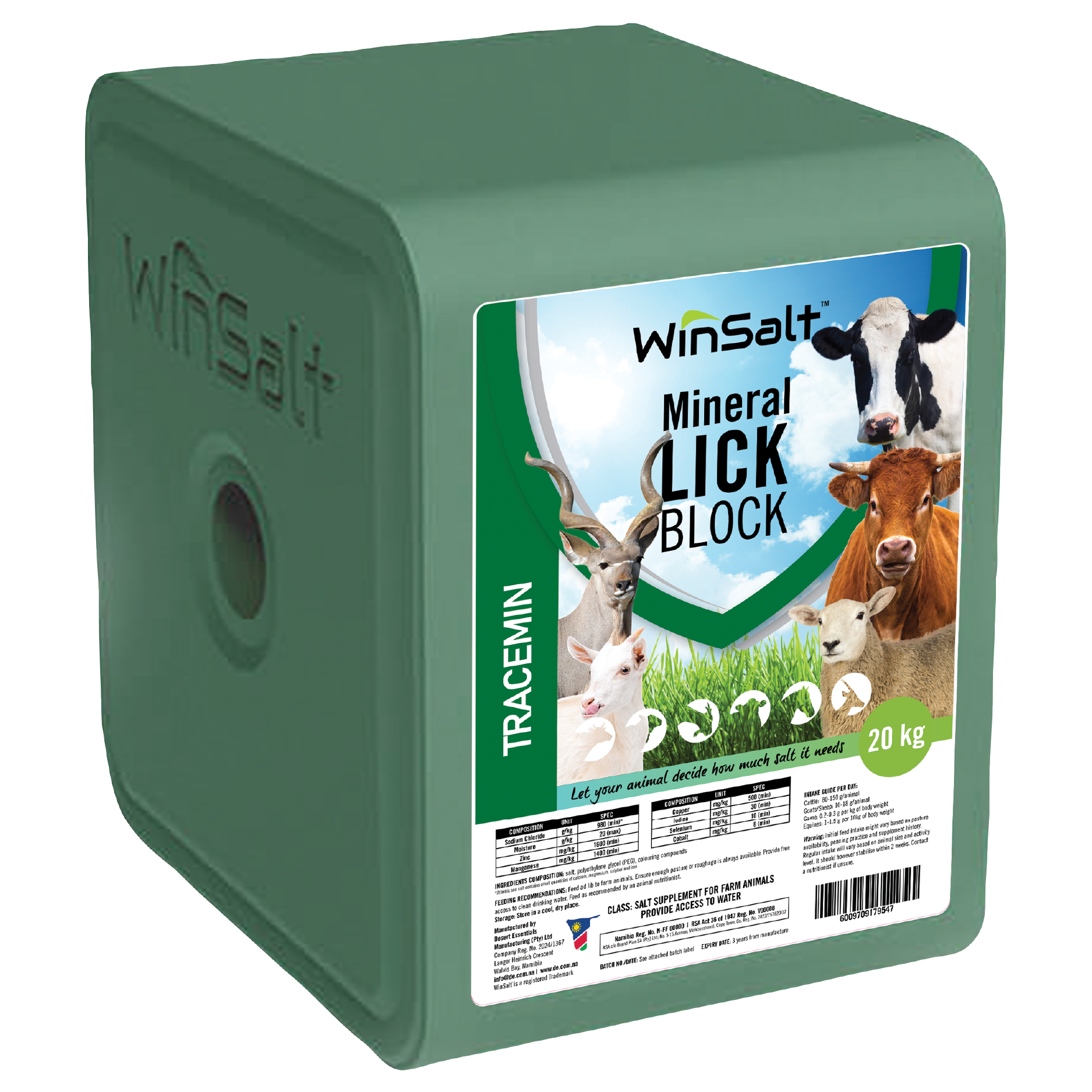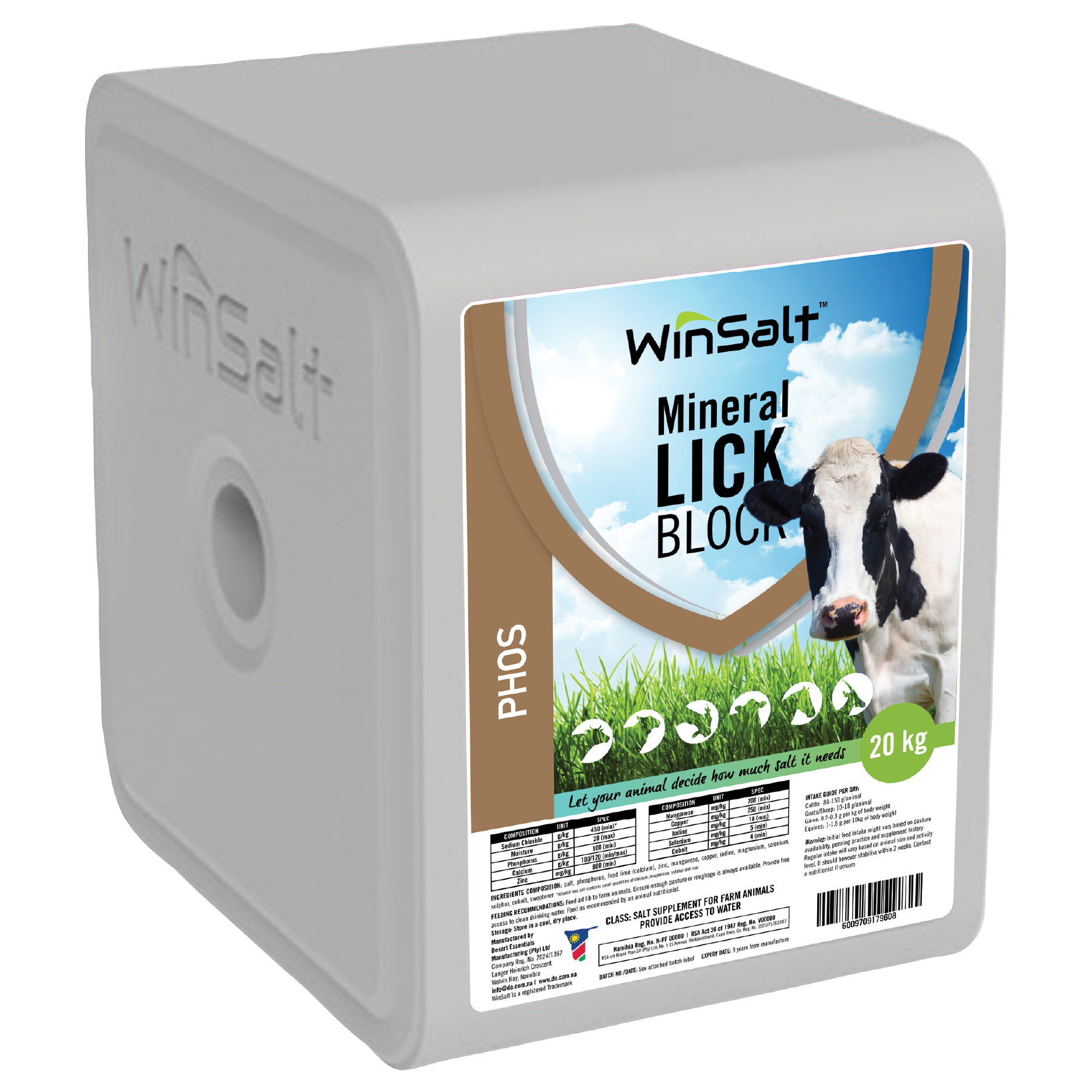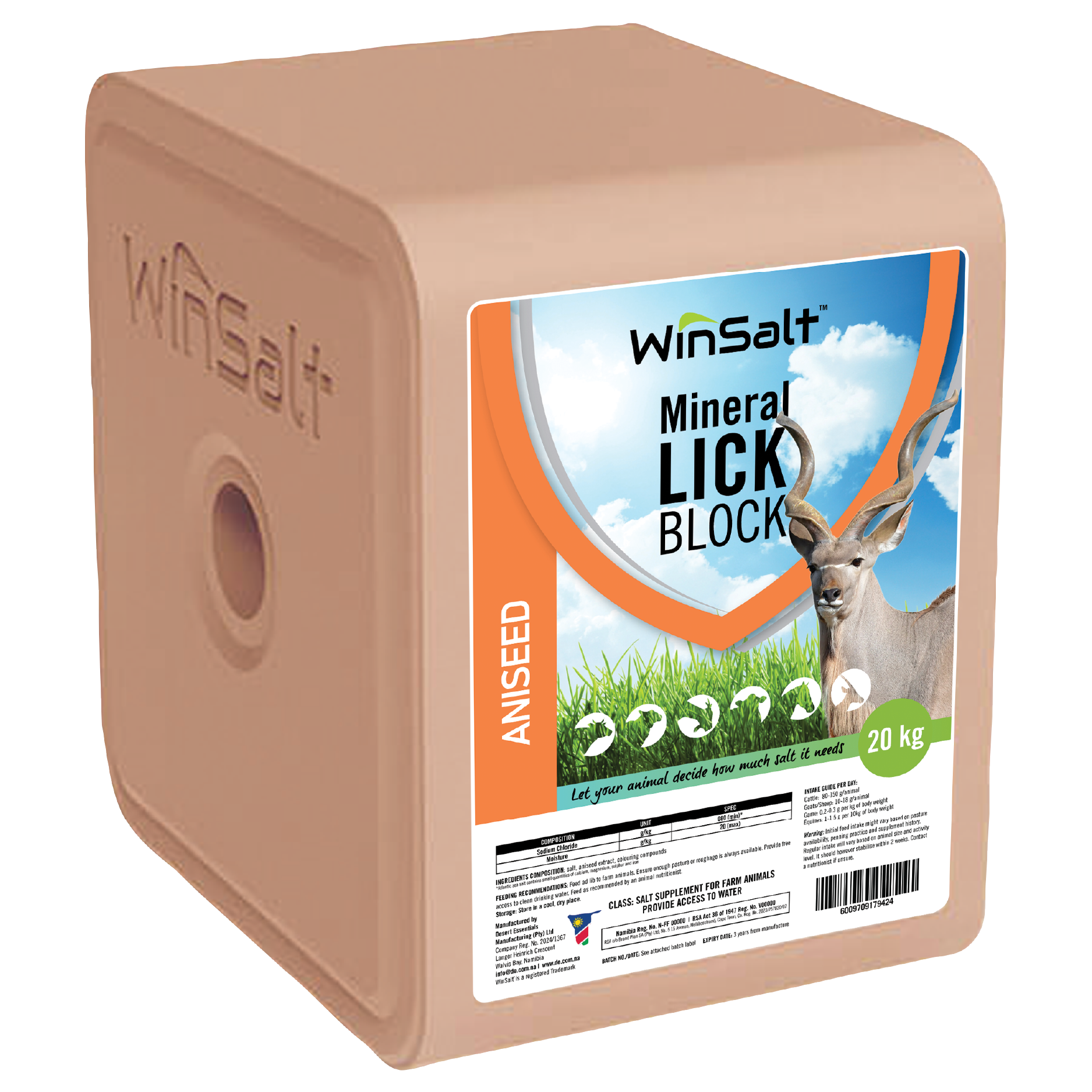 Our salt lick blocks use the purest natural ingredients with salt locally sourced in Namibia. There are no additives aside from the salt and the specified minerals – no binding agents, sediment or hidden chemicals! The blocks are compressed and are hard wearing in rain. They contain no urea so are not harmful when wet. They are free of hormones, growth promoters and antibiotics. A block form of salt allows animals to decide for themselves how much salt their body needs as daily needs vary. Naturally occurring minerals are not uniformly available – many areas have a low level of certain minerals in the soil and vegetation that requires supplementation to optimize animal health. By carefully adding minerals in quantities that meet daily requirements as balanced with a natural need for salt there is no risk of under or over-dosing as animals will instinctively decide how much salt they need. Available in a 20kg and a 10kg size block.